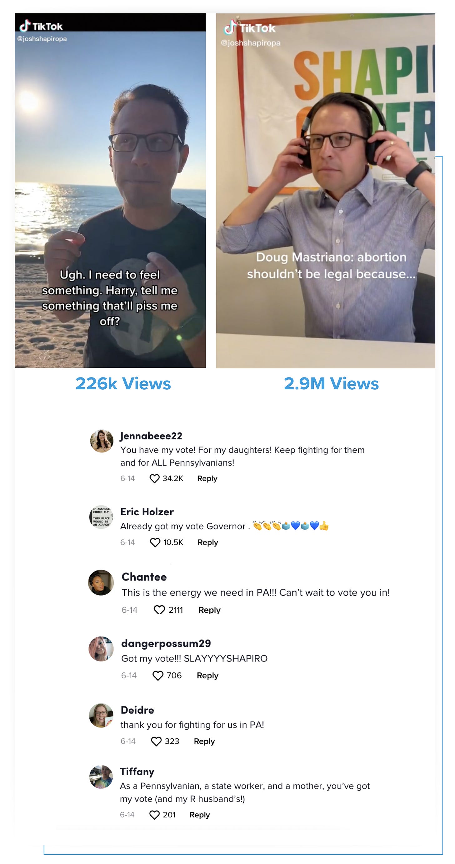 Additionally, Josh Shapiro, running for Governor in Pennsylvania, has successfully taken on the feud trend in his race against Doug Mastriano.