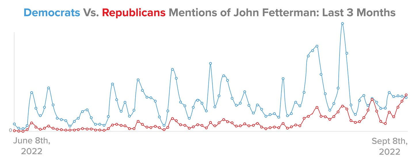 We only see some spikes in negativity as Republicans enter the conversation mentioning Fetterman more recently.