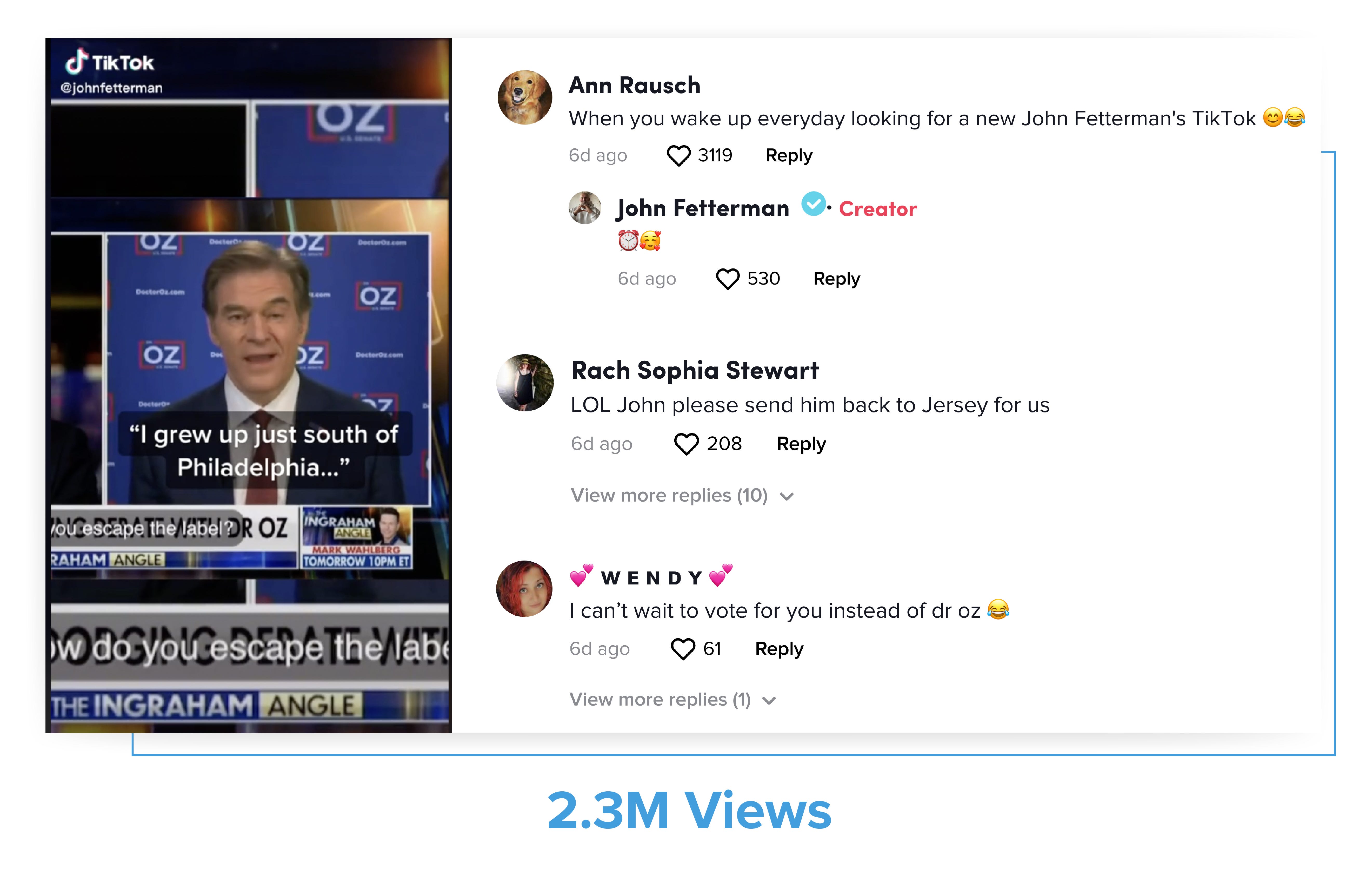 While being present on social media has become vital for any candidate running for office, we are seeing more and more candidates opting into the trends on social media. No candidate has received as much attention for their online strategy as John Fetterman. He has embraced more non-traditional political advertising by going online, showing off his personality, and trolling his opponent Dr. Mehmet Oz. But all of this is only made possible by having a clear understanding of his target audience on the platforms.
