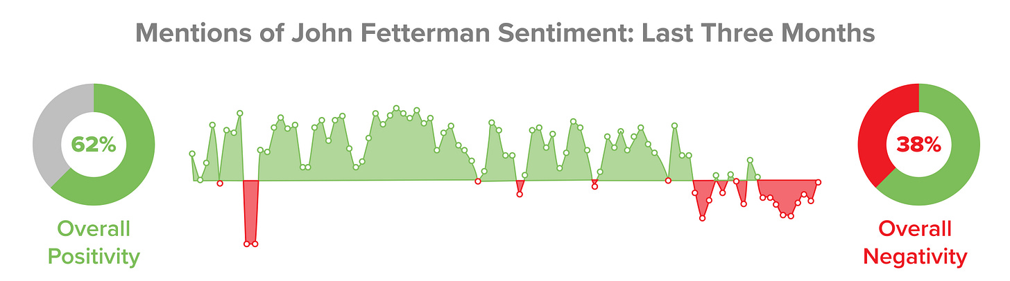 Over the last three months, the majority of mentions of John Fetterman have been overwhelmingly positive.