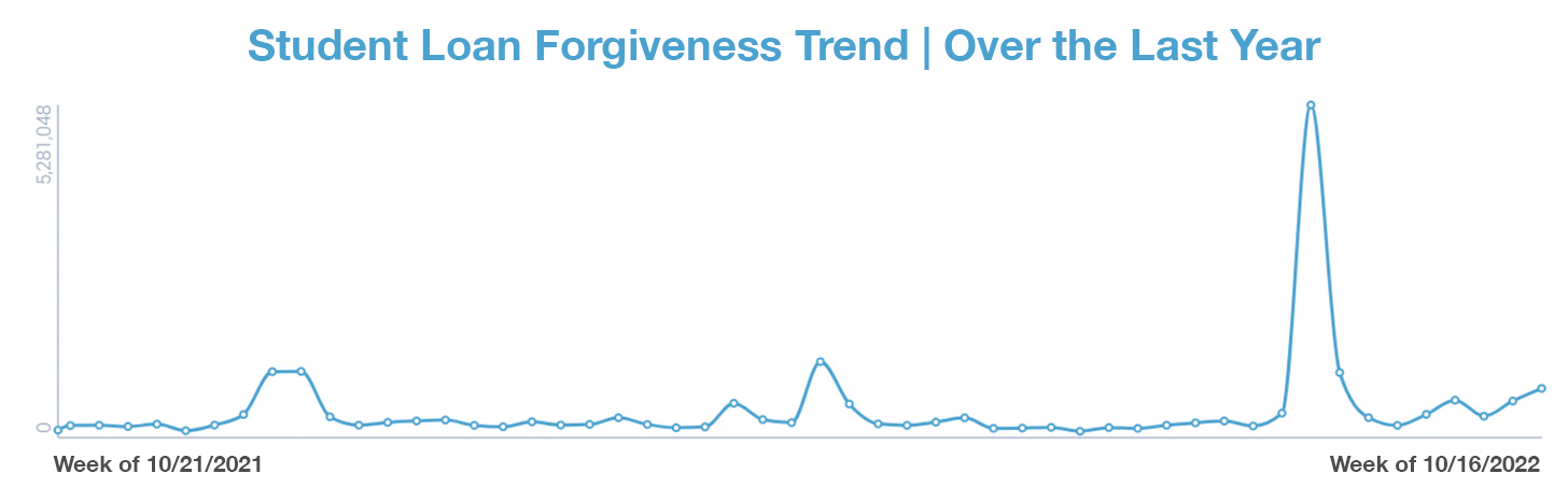 Since this initial announcement in August, the volume has dropped back down, but we see a rise again as appreciation for the student loan debt relief application has built over the last week. Google tracks the same trends in search and predicts that interest will only continue to increase over the next few weeks.