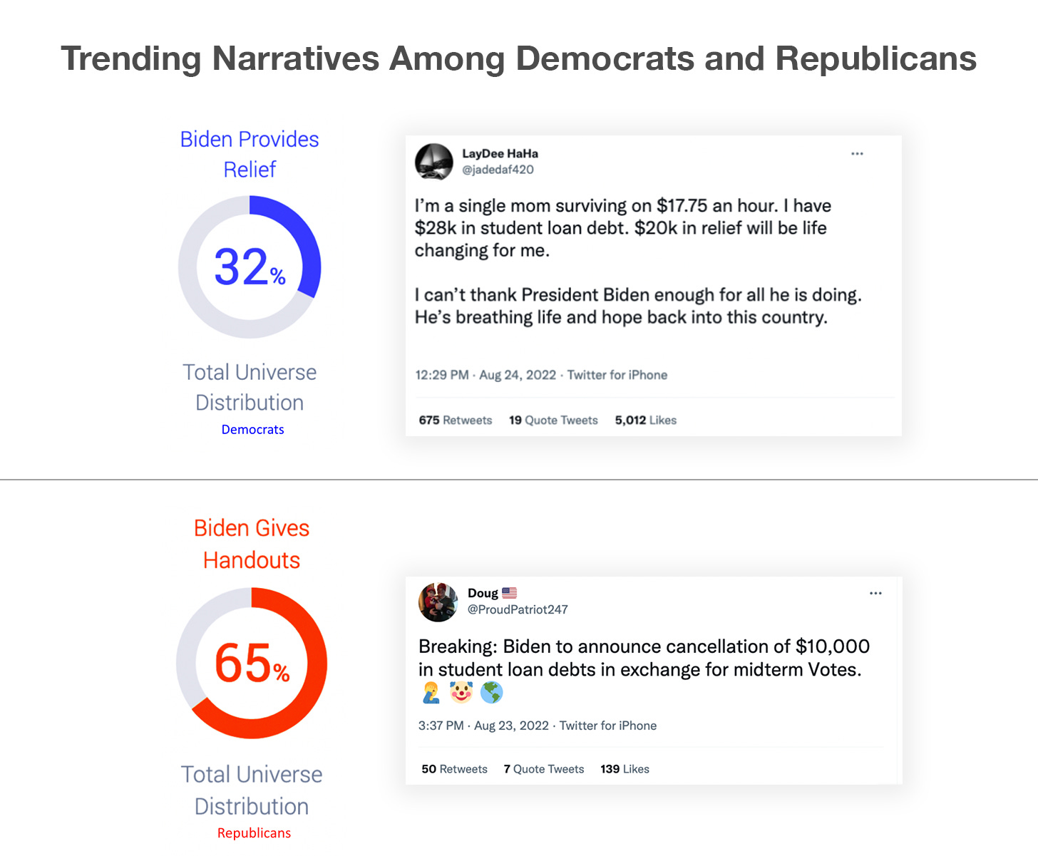 The discourse about student loan forgiveness is overwhelmingly non-partisan, but when we analyze the online discussion among self-identified Democrats and Republicans it is clear that Democrats are leading the narrative in the discourse.